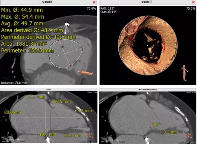患者為68歲女性,14年前因“反復(fù)感冒、氣促”,檢查發(fā)現(xiàn)心臟瓣膜病,接受了“二尖瓣機(jī)械瓣置換術(shù)”。約5年前出現(xiàn)雙下肢水腫,活動(dòng)后心累氣緊,心臟彩超提示:三尖瓣返流。近年來(lái)三尖瓣返流逐漸加重并伴有輕微黃疸、雙下肢水腫,雖長(zhǎng)期服用利尿劑治療,但效果欠佳。郭惠明教授團(tuán)隊(duì)結(jié)合病史、超聲及CT評(píng)估,考慮患者瓣膜置換術(shù)后,三尖瓣重度返流,再次開(kāi)胸行體外循環(huán)手術(shù)風(fēng)險(xiǎn)高,經(jīng)團(tuán)隊(duì)整體評(píng)估,決定采用最適合患者的LuX-Valve三尖瓣置換系統(tǒng)行微創(chuàng)治療,根據(jù)測(cè)量結(jié)果選擇植入JS/TTVI-28-55型號(hào)的LuX-Valve瓣膜。