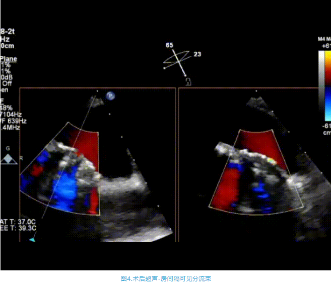 術(shù)中首先在局麻下穿刺股動脈、股靜脈,完成心導(dǎo)管檢查評估后轉(zhuǎn)為全麻,在食道超聲引導(dǎo)下穿刺房間隔,穿刺成功后將加硬導(dǎo)絲送入左上肺靜脈建立軌道,根據(jù)患者病情行球囊預(yù)擴(kuò)張后植入6mm孔徑房間隔造孔支架,經(jīng)透視及食道超聲評估支架左右盤展開良好,夾持于房間隔兩側(cè),固定穩(wěn)定、位置良好,食道彩超顯示房水平右向左為主分流,分流孔直徑符合預(yù)期大小,心導(dǎo)管檢查評估達(dá)到預(yù)期效果,釋放造孔支架。術(shù)后12h患者下床活動,恢復(fù)順利,擬于近日完善術(shù)后評估后出院。