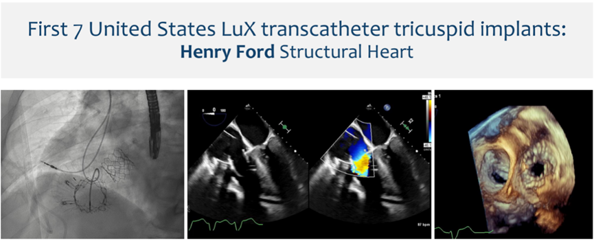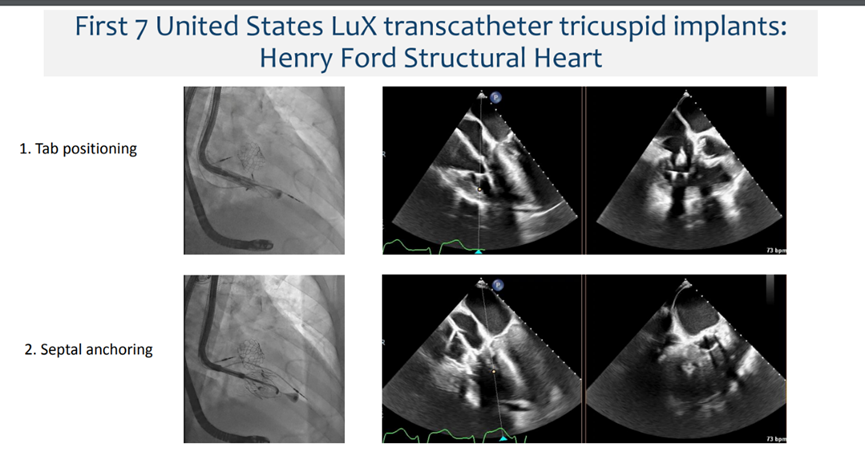 Dee Dee Wang教授隨后分享了Henry Ford Hospital前7例LuX-Valve Plus的植入經(jīng)驗,并提示術(shù)中確定瓣葉夾持鍵的位置處于三尖瓣瓣環(huán)下方(右心室側(cè)),以及室間隔固定片與室間隔的相對位置關(guān)系是最關(guān)鍵的兩個步驟。通過經(jīng)胃底短軸切面,配合右室流入/流出道切面的X-plane就能較容易地獲取相關(guān)影像。由于LuX-Valve Plus對超聲影像的要求較低,手術(shù)過程簡單易操作。