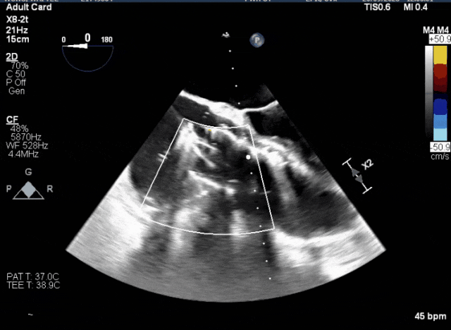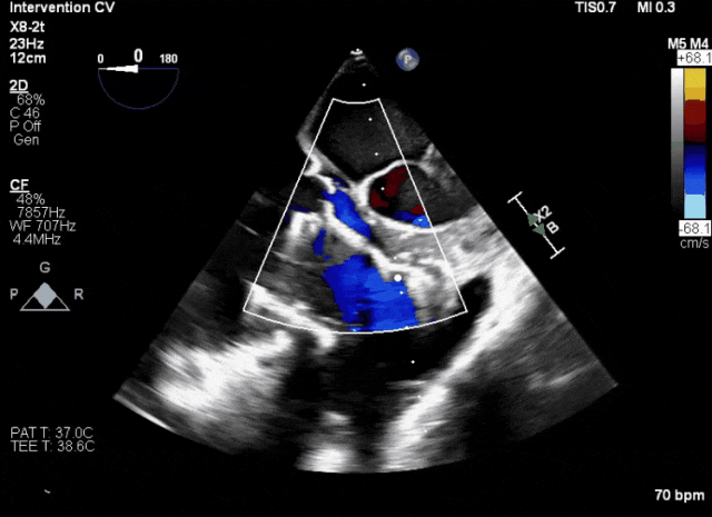 1、患者左心機(jī)械瓣術(shù)后,術(shù)中TEE成像有偽影干擾;2、三尖瓣重度反流,右心房、心室嚴(yán)重?cái)U(kuò)張致三尖瓣葉拴系,Gap:15.3mm,注意阻擋件抓取瓣葉操作。