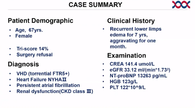 67歲老年女性,雙下肢水腫7年,加重伴氣促1年,既往診斷右心衰竭,心功能III級(jí),伴不完全性右束支傳導(dǎo)阻滯,輕中度二尖瓣關(guān)閉不全,心臟擴(kuò)大。初步診斷以非風(fēng)濕性三尖瓣關(guān)閉不全(極重度)合并擴(kuò)張型心肌病收住入院,Tri-Score 14%, eGRF 33.12ml,NT-proBNP 13263 pg/mL。
