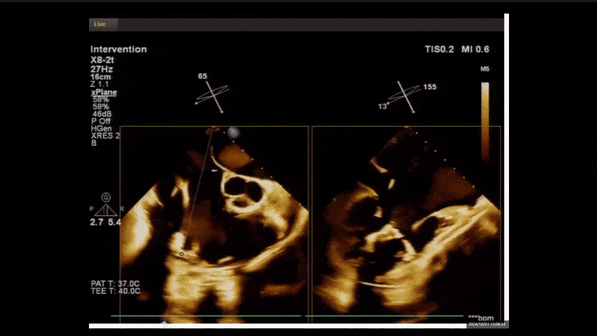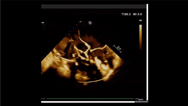 術(shù)中經(jīng)食道超聲輔助下可見(jiàn)LuX-Valve Plus夾持件抓捕瓣葉狀態(tài)良好,夾持件在位,室間隔錨定位置良好,假體瓣膜整體錨定狀態(tài)穩(wěn)固。